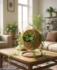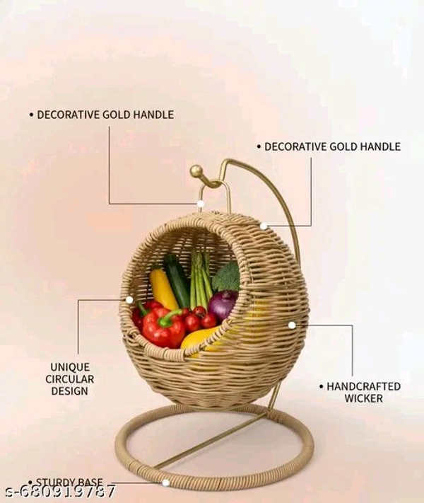 Name: Handcrafted Wicker Hanging Basket with Gold Handle, Round Display Stand, Decorative Storage for Fruits, Desserts, Home Décor
