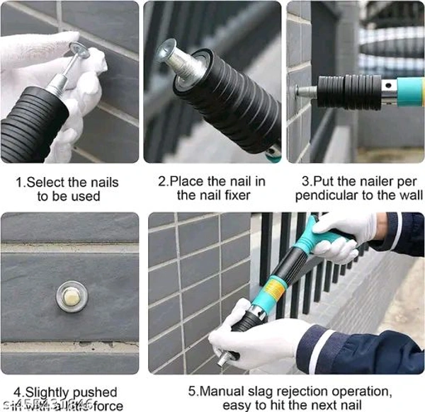 This lightweight concrete nail gun is powered by hand. Easy to use, 1. Wear protective glasses, gloves, and earplugs. 2. Choose the nail. 3. Nail gun vertically at the workplace ready to shoot. 4. Vertical force into the wall. 5. Hold the muffler cover, and compress it many times.